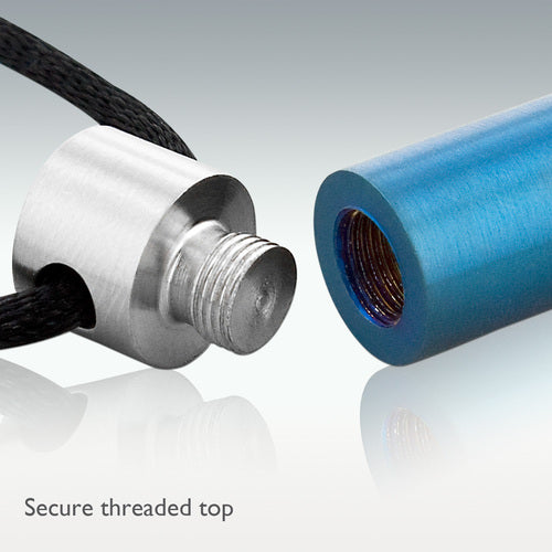 Asche Anhänger Blau Urnti ist zylinderförmig und besitzt eine originelle Farbe: samtigblau. Dessen rare Farbe marcht den Gedenkschmuck außergewöhnlich. Ungleich marineblau oder türkisblau ist samtigblau eleganter und lebendiger. Der Asche Schmuck ist Zwillingsprodukt des Asche Anhängers Urnta, der ist silberfarben und dessen Design ist diskreter und weinger originell im Vergleich zu dem Asche Anhänger Blau Urnti.