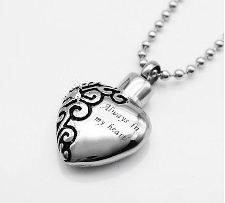Der herzförmigen Asche Anhänger besitzt ein sehr elegantes Design. Dieser Asche Anhänger ist halb mit artistische Motiven geziert und halb mit einem englischen Ausdruck eingraviert: "Always in my heart", was bedeutet "immer in meinem Herz" auf Deutsch. Der Asche Schmuck stellt Ihre tiefe Liebe gegenüber Ihrem verelorenen Begleiter dar.