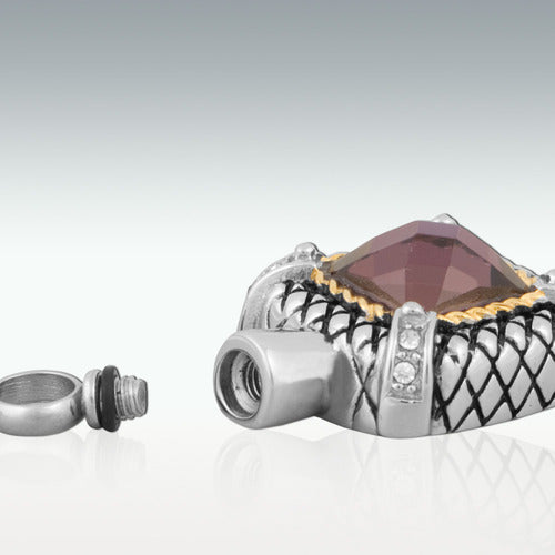 Der Gedenkanhänger Purla ist zugrunde silberfarben und besitzt einen grossen violetten viereckigen Strass mit golden Bordte.Der Asche Anhänger hat Vintage Stil und liegt im Trend. Einige schwarz Motive sind auf dem Asche Anhänger gezeichnet. Vier Greifer schützen den grossen Strass im Mittel. Tragend solch Urne Anhänger um den Hals herum werden Sie einzigartig sein.