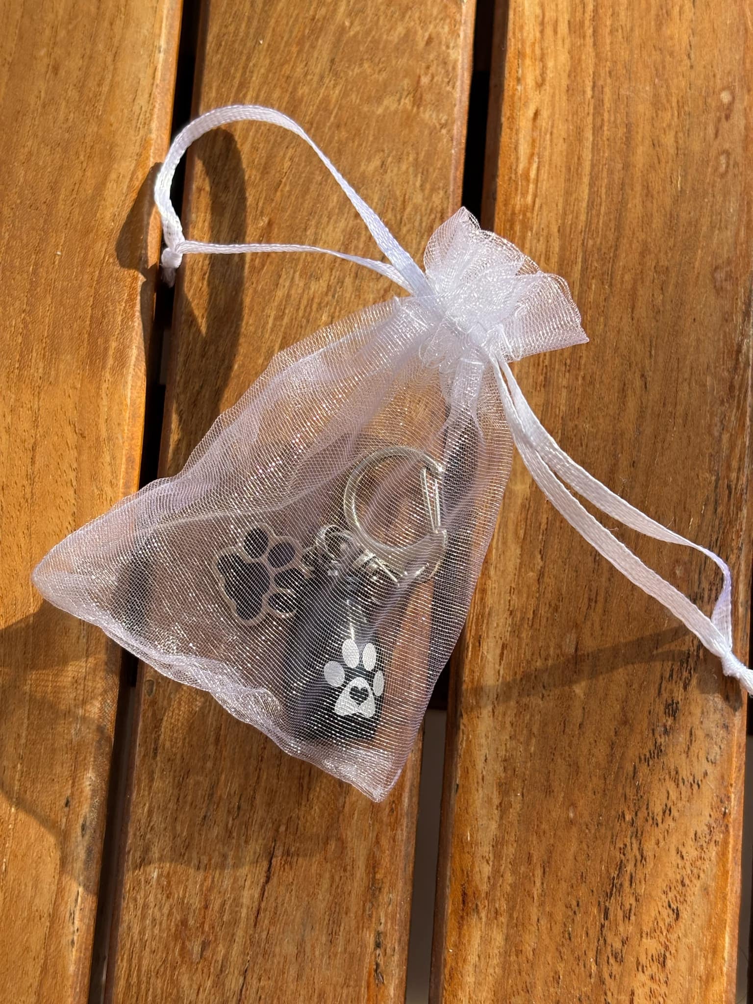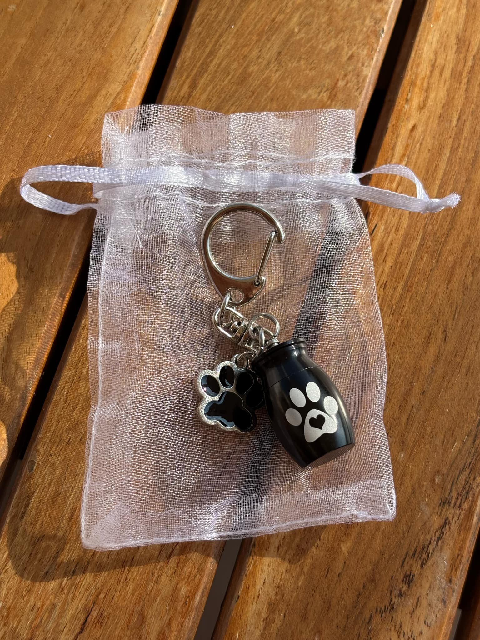 Bewahren Sie mit diesem schwarzen Urnen-Schlüsselanhänger aus Metall mit Pfotenabdruck eine wertvolle Erinnerung an Ihren Hund. Dieses dezente Schmuckstück bietet Ihnen die Möglichkeit, eine kleine Menge der Asche Ihres Vierbeiners einzufügen.