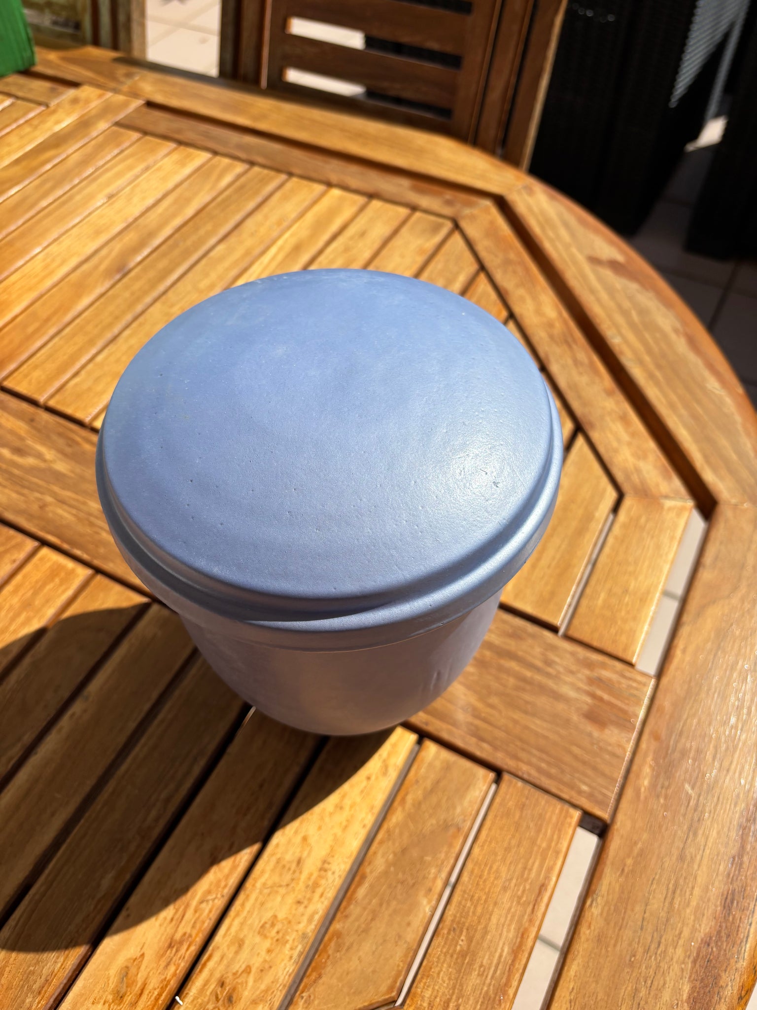 Diese Urne hat eine obere Öffnung mit einem sicheren versehenen Deckel.