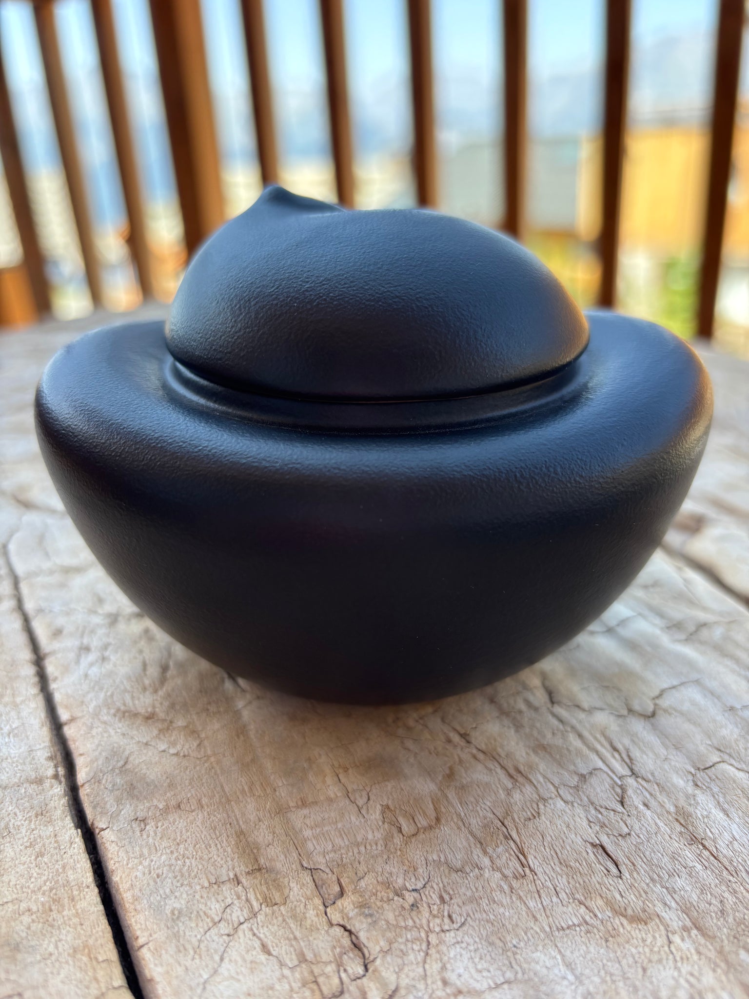 Diese Urne besteht aus Keramik. Diese Urne hat eine obere Öffnung mit einem sicheren Deckel.