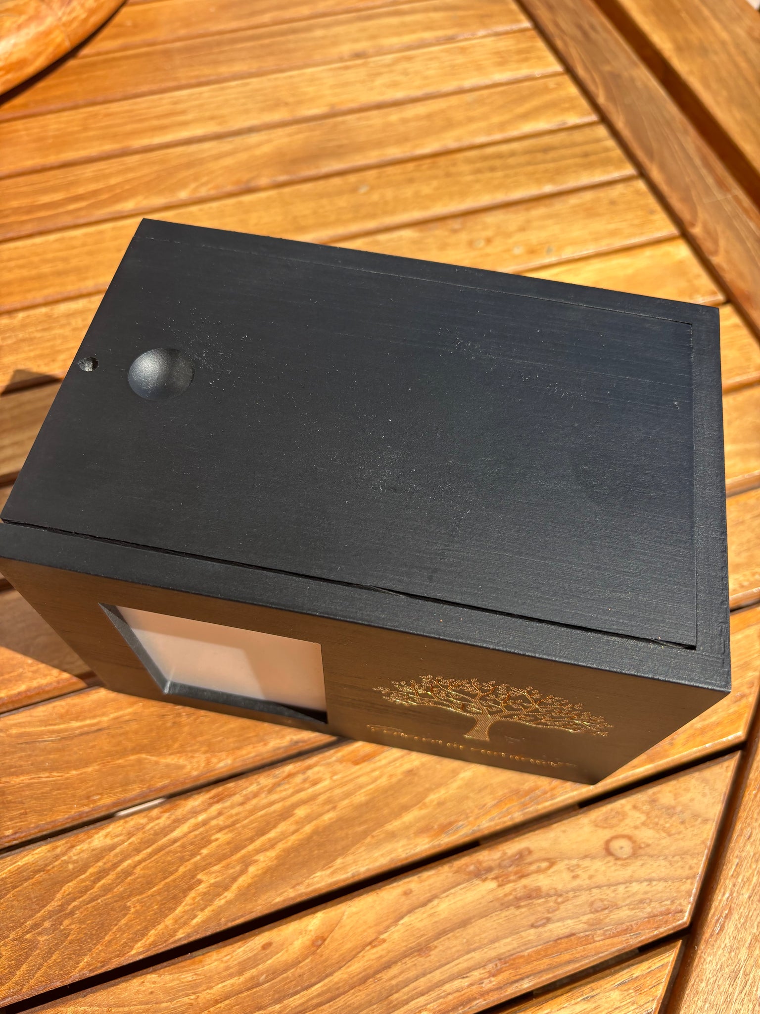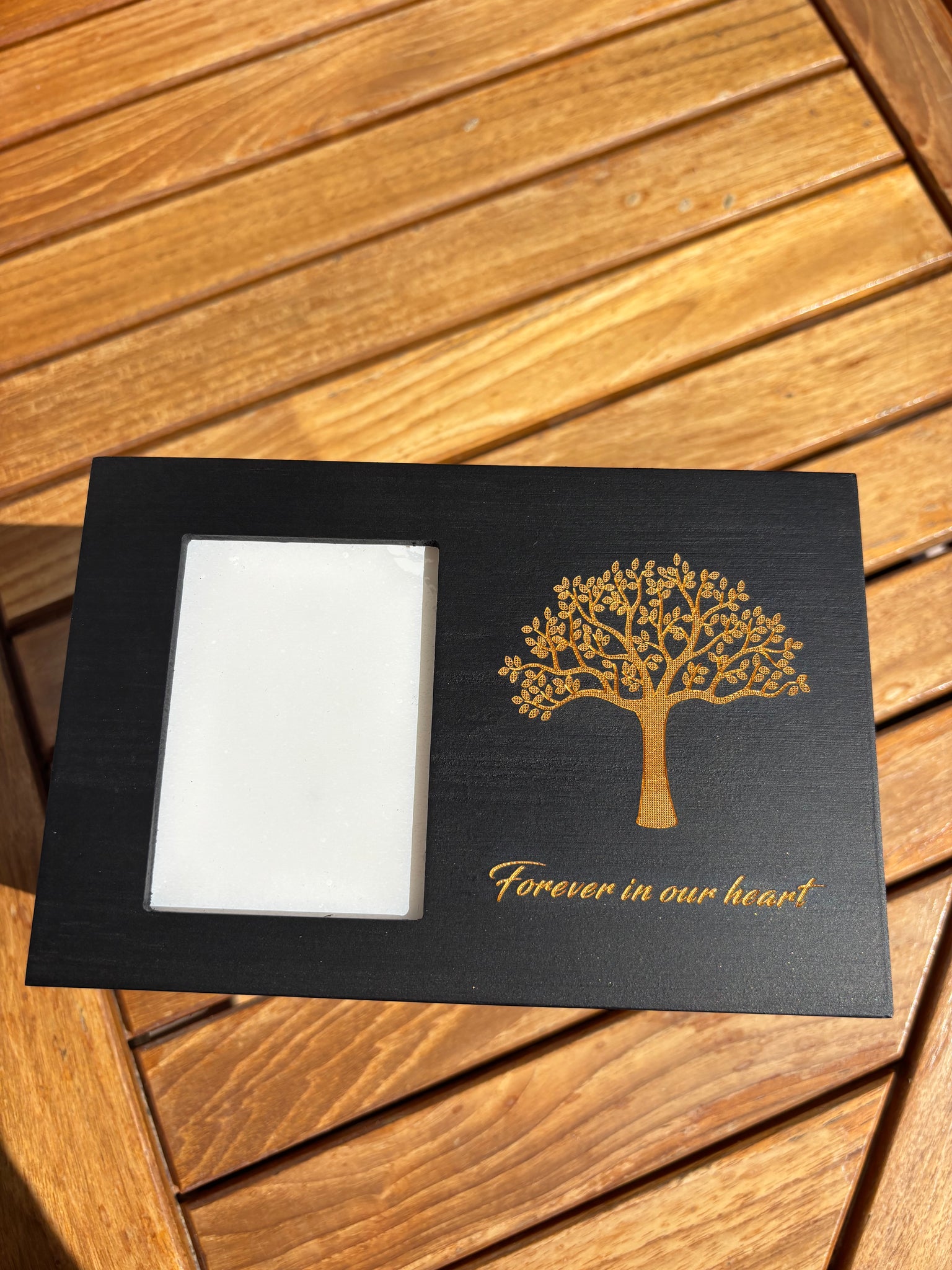 Diese aus Holz gefertigte Fotourne ist ein schönes Andenken an Ihren verstorbenen Hund oder Ihre Katze . Sie enthält nicht nur die Asche, sondern auch andere Gegenstände, die Ihnen wichtig sind, wie zum Beispiel eine Haarlocke oder eine Halskette.