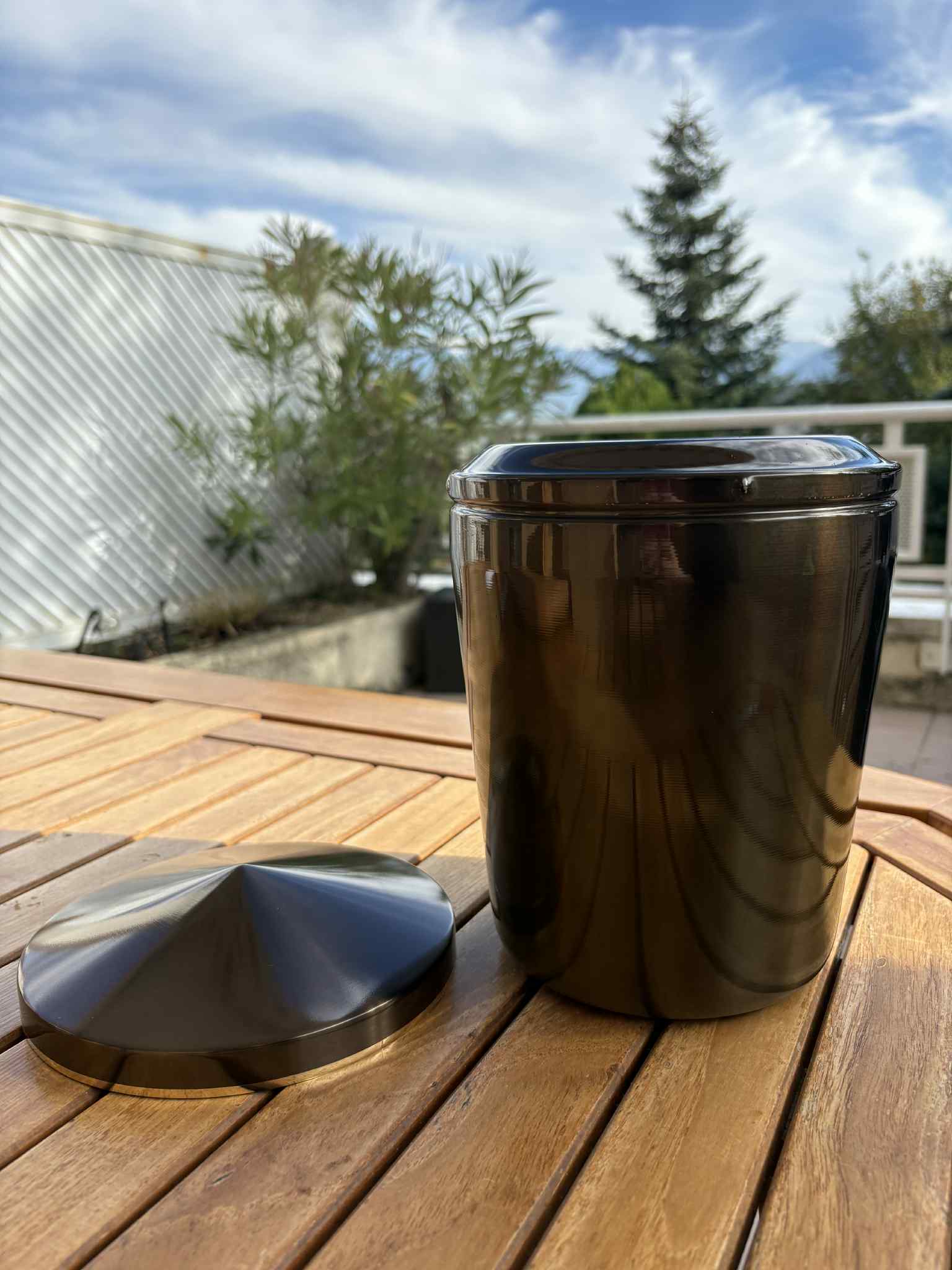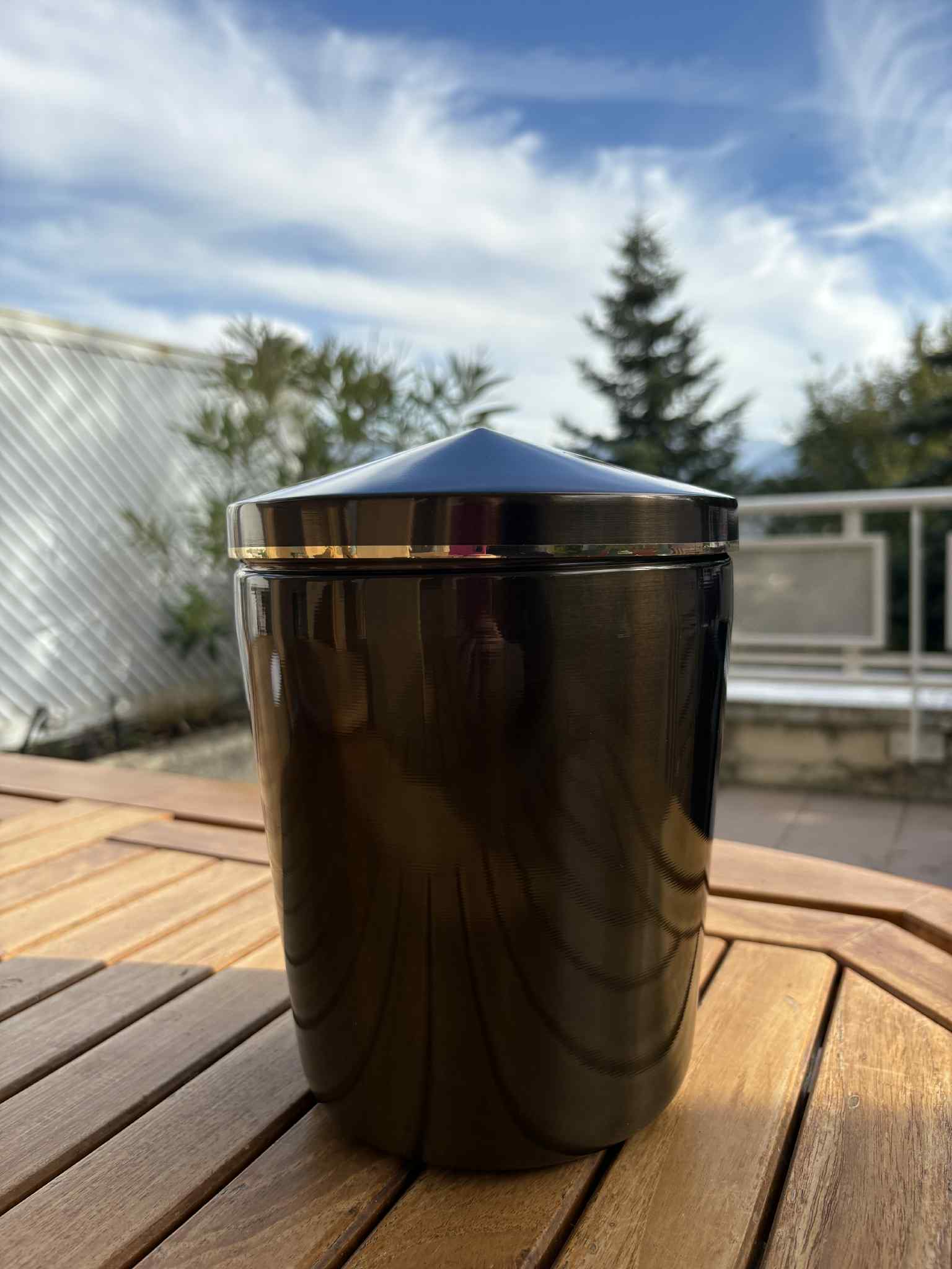 Diese Bestattungsurne aus Metallist sorgfältig poliert, um ihm ein glänzendes Aussehen zu verleihen. DieUrne aus Metall FERRER ist ein modernes Bestattungsprodukt: der leicht scharfe Deckel und der goldene Rand verleiht ihm einen originellen Touch.