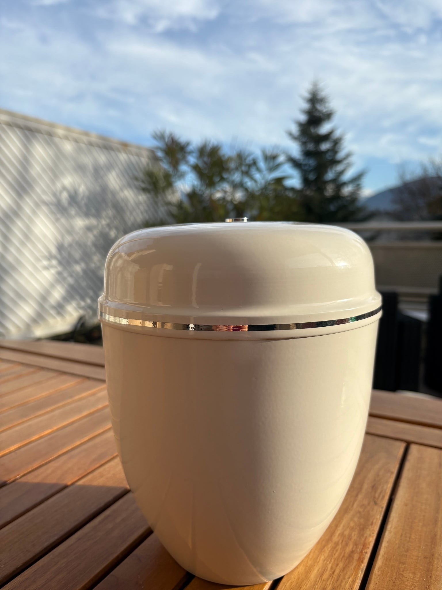 The white Paris funeral urn features an elegant white finish and a simple design, enhanced by a discreet silver border. Available in a predominantly solid color, this urn has no patterns, engravings, or decorative imprints, preserving its clean and harmonious aesthetic. The white Paris funeral urn is a simple, modern, and respectful funeral product.