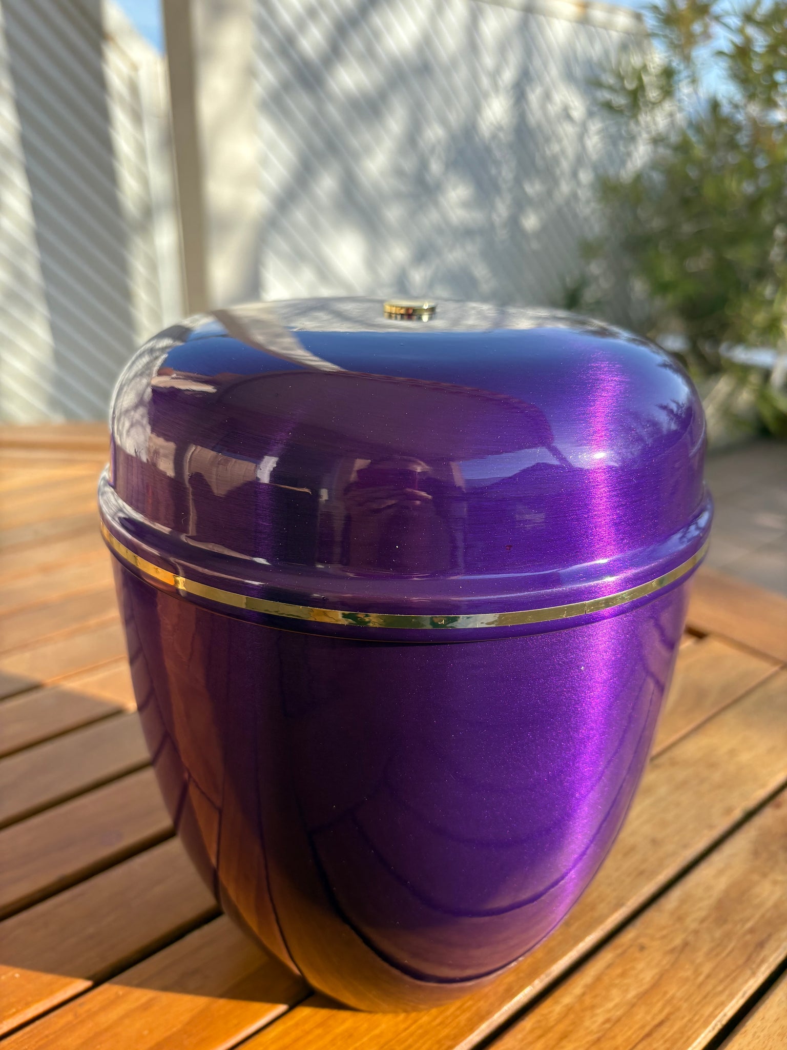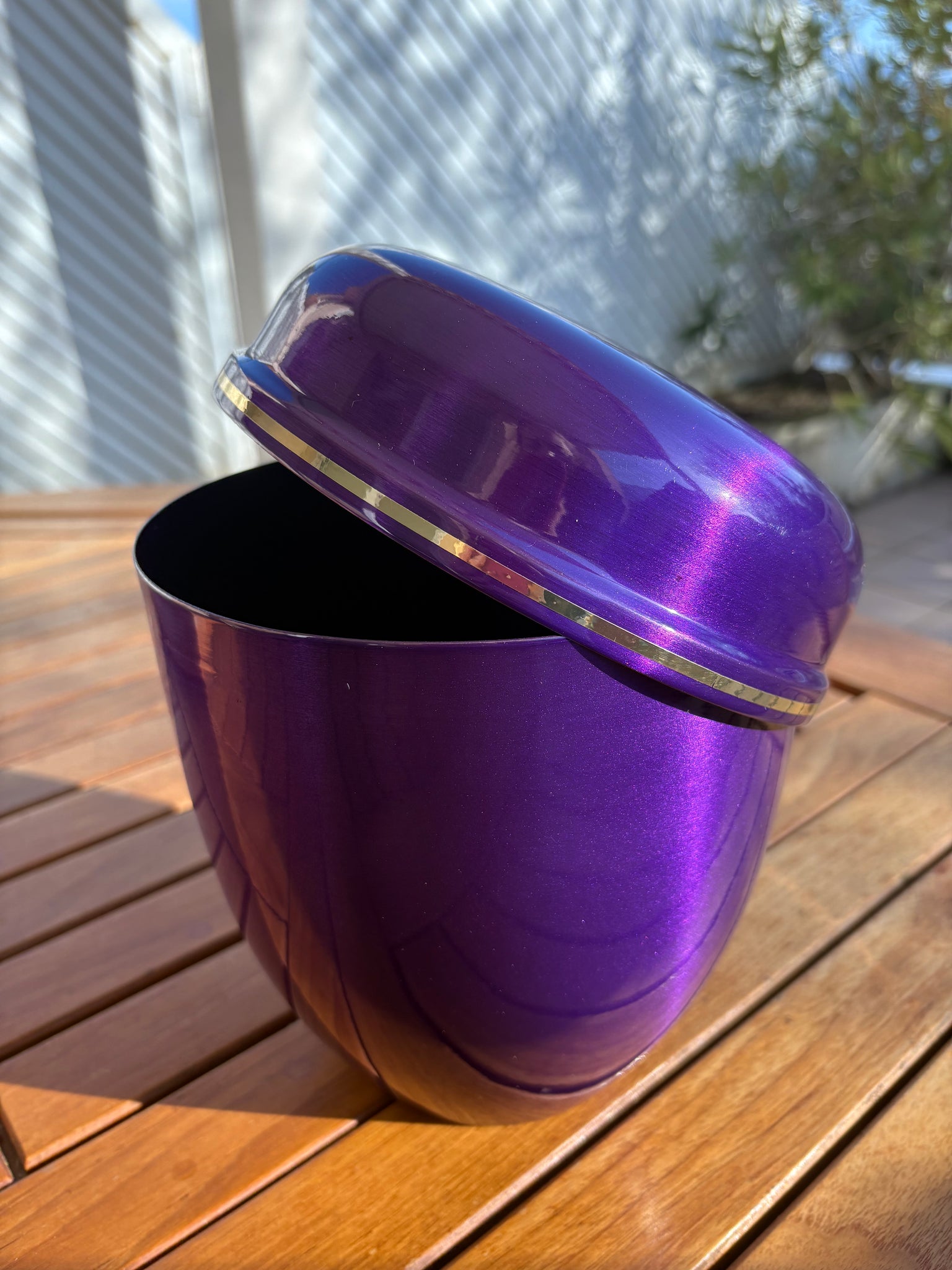 The Paris Violette funeral urn stands out with its deep, elegant purple finish and slightly pearlescent sheen, lending it a soft, modern look. Its understated design is subtly enhanced by a discreet gold border that harmoniously highlights its rounded lines. Available in a solid color, this urn has no patterns, engravings, or decorative imprints, preserving a refined, soothing, and timeless aesthetic. The Paris Violette funeral urn is a simple, modern, and respectful funeral product, designed for a dignified and serene tribute.